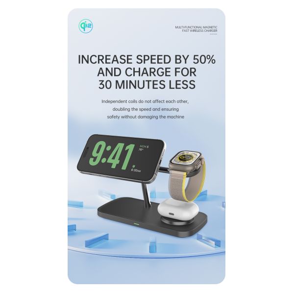 The Magnetic Wireless Charging Pad has a power input of PD/QC3.0/9V-3A/12V-2.5A, ensuring that your device charges quickly and efficiently. The charging pad's magnetic induction phone charging technology ensures that your device stays in place while charging, preventing any accidental falls. The Wireless Magnetic Docking Station is also equipped with a 3W watch output, making it a versatile charging solution for all your mobile devices.